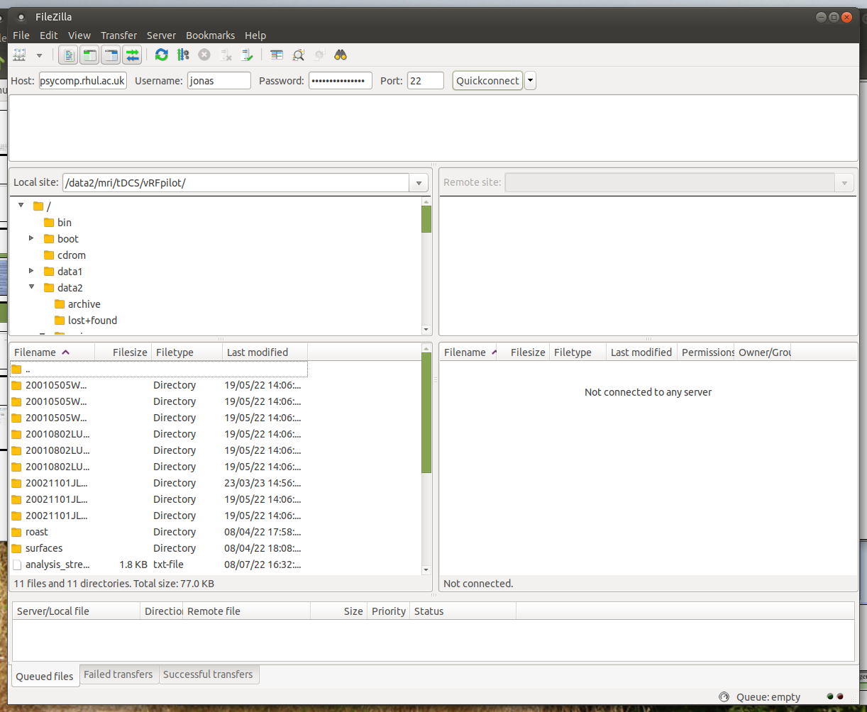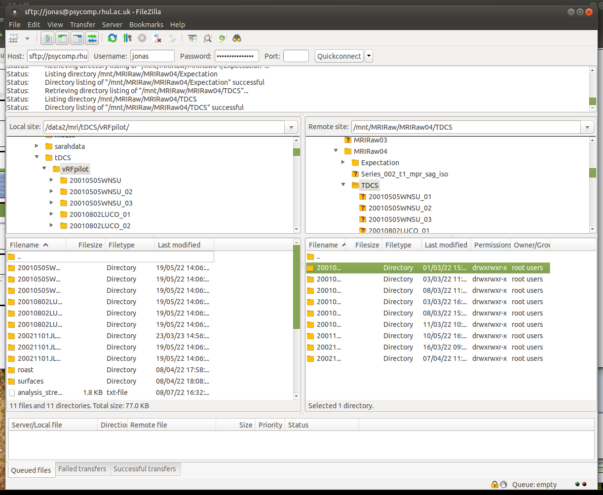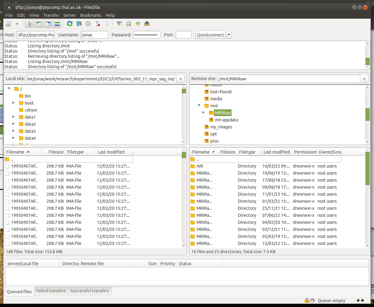 RHUL users: Data from the MRI scanner are uploaded onto the MRIRaw folder, accessible from the cluster or psycomp. Please see OS-specific instructions for downloading the data to a local PC below using secure FTP.