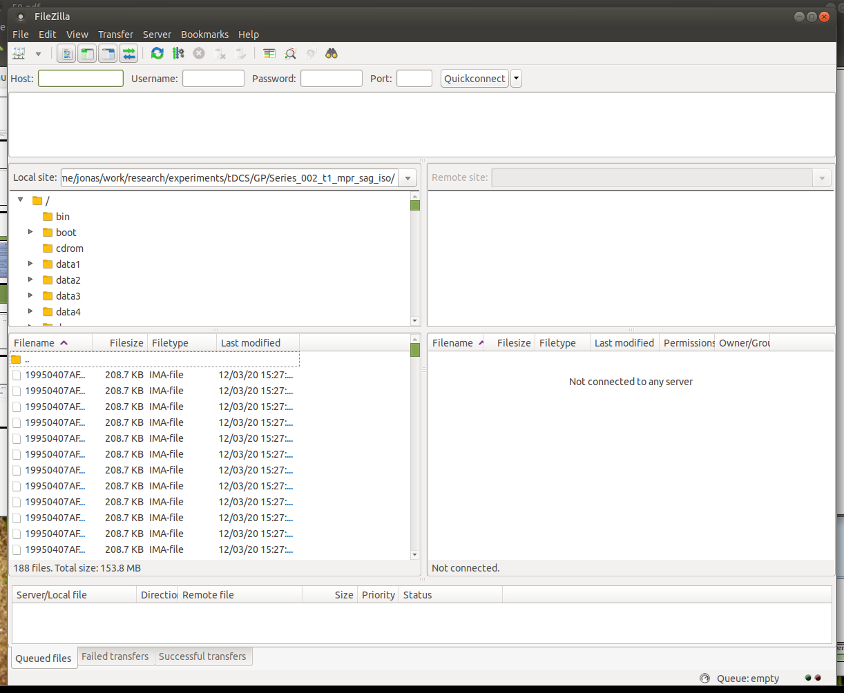 In the right-hand pane, navigate to the MRIRaw folder. On the cluster, MRIRaw is at the top of the folder hierarchy (/MRIRaw); on psycomp, it is in the /mnt folder (/mnt/MRIRaw). You can simply type in the path to the folder in the “Remote site:” text box, e.g. /mnt/MRIRaw on psycomp:
